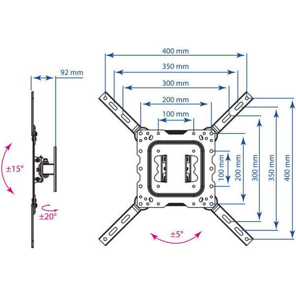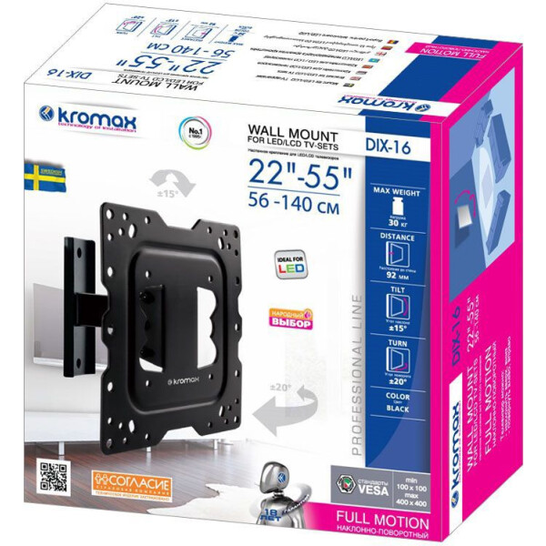 Kromax DIX-16 - это настенный наклонно-поворотный кронштейн, обладающий надежнейшей конструкцией. Данная модель кронштейна предназначена для настенного крепления мониторов и телевизоров с диагональю экрана от 56 до 140см. Отличительным достоинством данной модели кронштейна является возможность настройки не только углов поворота и наклона экрана удерживаемого устройства, но и угла вращения экрана относительно стены в диапазоне ±5°. Стоит отметить, что кронштейн DIX-16 от компании Kromax обладает надежной стальной конструкцией, которая способна выдерживать нагрузку до 30кг.