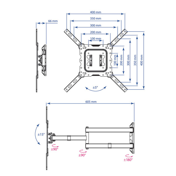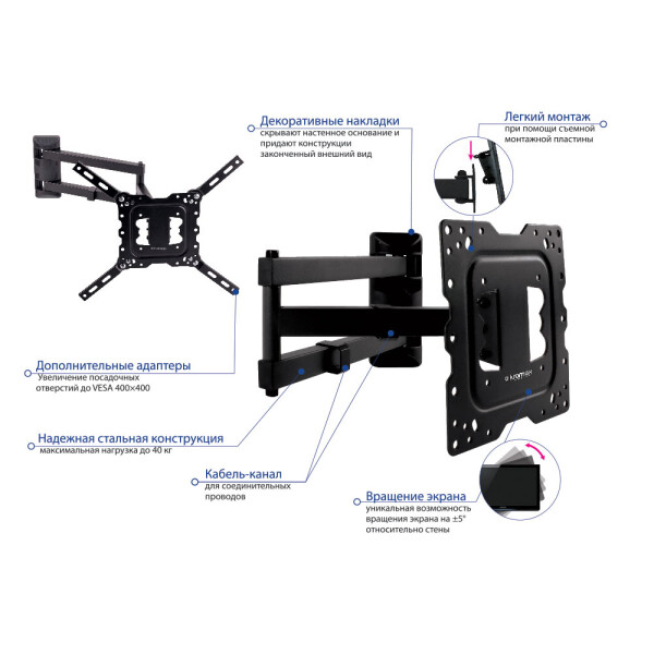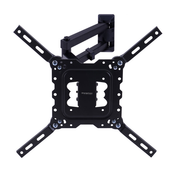 Мощный кронштейн имеет множество регулировок, такие как: наклон вверх-вниз на 15°, поворот влево или вправо на 90°, складываться к стене на максимально близкое расстояние до 66 мм или отодвигается от нее на максимально возможное расстояние до 605 мм, при помощи двух коленной конструкции.