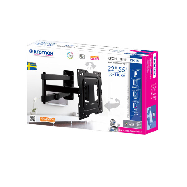Стальной наклонно-поворотный кронштейн для больших LED/LCD телевизоров, с диагональю экрана от 22 до 55 дюймов (56-140 см) и максимальным весом до 40 кг.