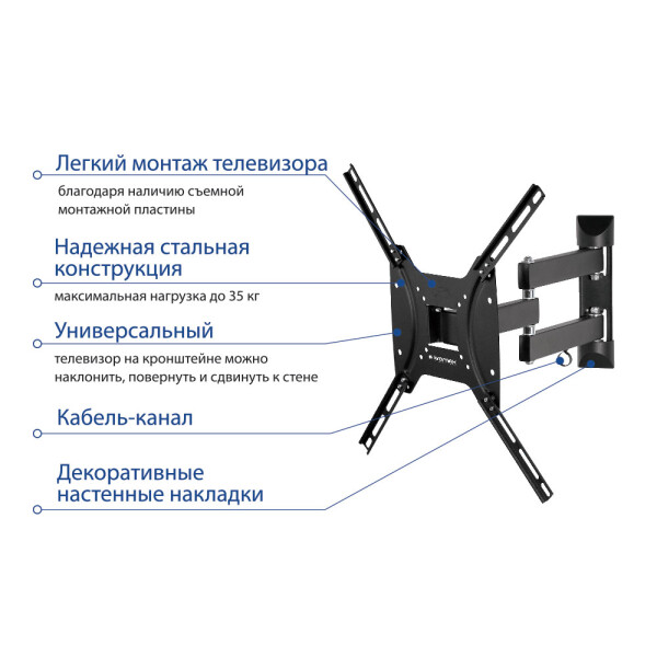 Кронштейн Kromax Optima-404 подходит для установки телевизоров и мониторов с диагональю экрана от 15 до 55 дюймов. Модель позволяет регулировать углы наклона и поворота. Система шарниров позволяет регулировать положение экрана телевизора. В комплекте поставки крепления есть вся необходимая фурнитура для монтажа.