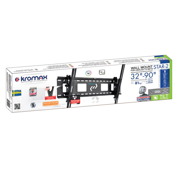 Наклонный кронштейн KROMAX STAR-2 предназначен для огромных OLED/LED/LCD/плазменных телевизоров с диагональю экрана от 32 до 90 дюймов (81-229см).
