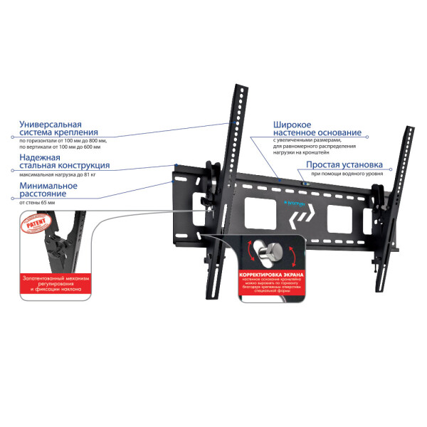 Настенное основание кронштейна можно выровнять по горизонту, даже после установки кронштейна на стену, при помощи четырех крепежных отверстий специальной формы.