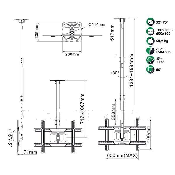 Телескопический потолочный наклонно-поворотный кронштейн для телевизоров и мониторов с диагональю от 32 до 70 дюймов.