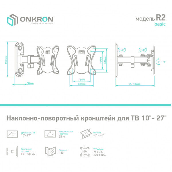 Кронштейн наклонно-поворотный Onkron Basic R2, отличается оптимальной подвижностью, надежностью. Конструкция крепления Onkron Basic R2 рассчитана для телевизоров с размерами диагонали от 10 до 27 дюймов и максимальным весом до 25 кг. Кронштейн позволяет разнообразно изменять положение телевизора для удобного просмотра. Небольшой размер настенной монтажной площадки позволяет закрепить кронштейн практически на любой стене. Крепление имеет встроенный водяной уровень. Простой и эргономичный дизайн, высокое качество, аккуратный внешний вид.