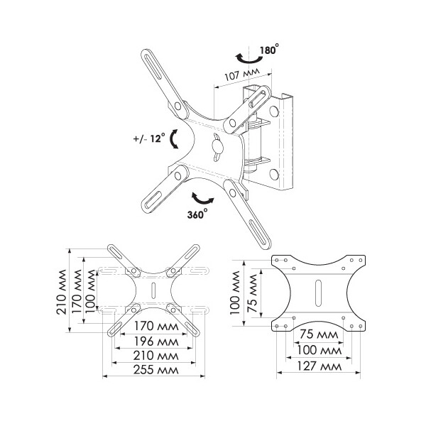 Trone - универсальный кронштейн для мониторов и ЖК-телевизоров, имеющих диагональ от 15 до 26 дюймов, осуществляющий наклон от -12 до +12 градусов, поворот на 90 и вращение на 360 градусов. Он позволяет размещать конструкцию выше уровня глаз, задействовав свободное пространство стены. Предельно допустимый вес, который способен выдержать кронштейн достигает 25 килограмм, что соответствует среднему весу большинства, даже самых крупногабаритных, моделей телевизоров. Кронштейн Trone поможет сэкономить место в Вашей квартире, а также разместить экран на высоте недосягаемой для маленьких детей или домашних питомцев.