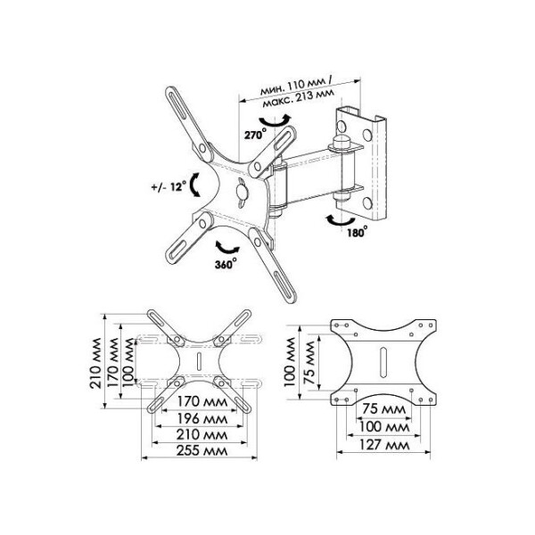 Trone - универсальный кронштейн для мониторов и ЖК-телевизоров, имеющих диагональ от 15 до 26 дюймов, осуществляющий наклон от -12 до +12 градусов, поворот на 180, вращение на 360 градусов и частичное складывание. Он позволяет размещать конструкцию выше уровня глаз, задействовав свободное пространство стены. Предельно допустимый вес, который способен выдержать кронштейн достигает 25 килограмм, что соответствует среднему весу большинства, даже самых крупногабаритных, моделей телевизоров. Кронштейн Trone поможет сэкономить место в Вашей квартире, а также разместить экран на высоте недосягаемой для маленьких детей или домашних питомцев.