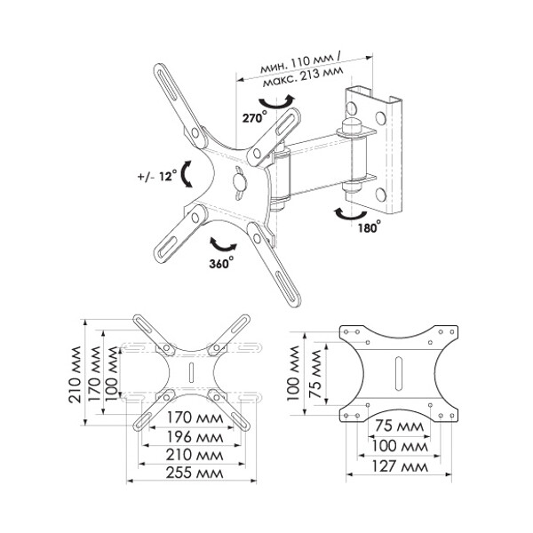 Trone - универсальный кронштейн для мониторов и ЖК-телевизоров, имеющих диагональ от 15 до 26 дюймов, осуществляющий наклон от -12 до +12 градусов, поворот на 180, вращение на 360 градусов и частичное складывание. Он позволяет размещать конструкцию выше уровня глаз, задействовав свободное пространство стены. Предельно допустимый вес, который способен выдержать кронштейн достигает 25 килограмм, что соответствует среднему весу большинства, даже самых крупногабаритных, моделей телевизоров. Кронштейн Trone поможет сэкономить место в Вашей квартире, а также разместить экран на высоте недосягаемой для маленьких детей или домашних питомцев.