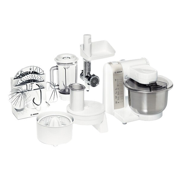 Кухонный комбайн Bosch MUM 4880 с мощностью мотора в 600 Вт – многофункциональная машина, предназначенная значительно облегчить работу хозяйки на кухне. С его помощью можно приготовить тесто практически любой консистенции, ведь для этого есть несколько насадок: для жидкого и крутого теста. Кроме того, в комплектность комбайна входит мясорубка, блендер, а также универсальная терка со специальными режущими дисками трех видов. Резиновые ножки-присоски не позволяют комбайну передвигаться по столу, обеспечивая безопасность при работе Bosch MUM 4880. А для любителей свежевыжатого сока имеется пресс для цитрусовых.