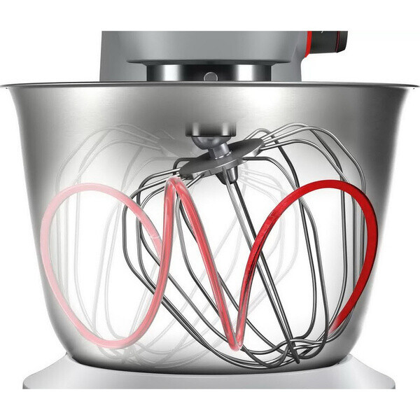 3D планетарный принцип вращения. Большая чаша 3,9л, из частично полированной нержавеющей стал и позволит замесить 2,7 кг теста или 1,9 кг дрожжевого теста. В комплекте: профессиональный набор кондитерских насадок (венчик с силиконовым покрытием, объемный венчик для взбивания (с регулировкой высоты), крюк для теста), мультирезка с 4-мя дисками (двусторонняя шинковка, двусторонняя терка, терка для сыра/ орехов/ шоколада, двусторонний диск терка/шинковка), пластиковый блендер (1,5 л) сумка для хранения насадок, прозрачная крышка с загрузочным отверстием.