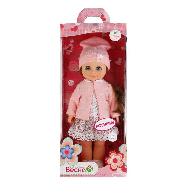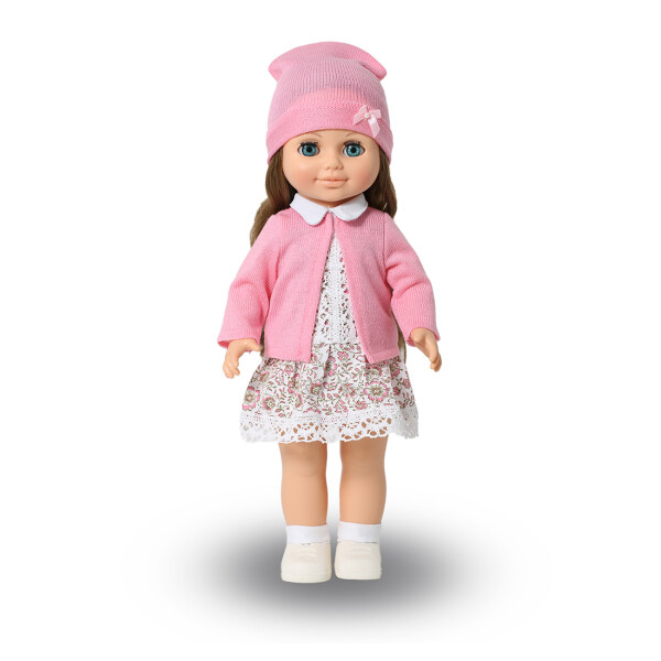Куклу Анна Весна 22 отличает новый, непохожий на других образ. Это очаровательная кукла-девочка с открытым взглядом, пушистыми ресницами, обаятельной улыбкой и роскошными волосами. Кукла представлена в комплекте одежды, куда входит: трикотажное платье без рукавов с отложным воротником, с застёжкой сзади на "Велкро"; жакет, вязанный гладью, с застёжкой спереди на "Велкро"; шапка, вязанная гладью, с отворотом по низу; трикотажные носочки, обувь – кроссовки.
