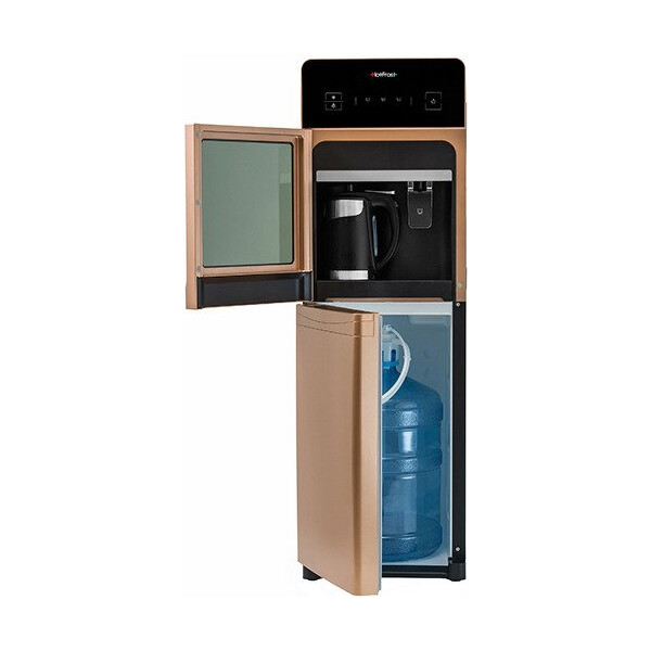 Бутыль устанавливается внизу кулера за дверцей. Такая компоновка делает механизм подачи жидкости скрытым от глаз окружающих, а также предотвращает развитие водорослей, способных испортить вкус воды.