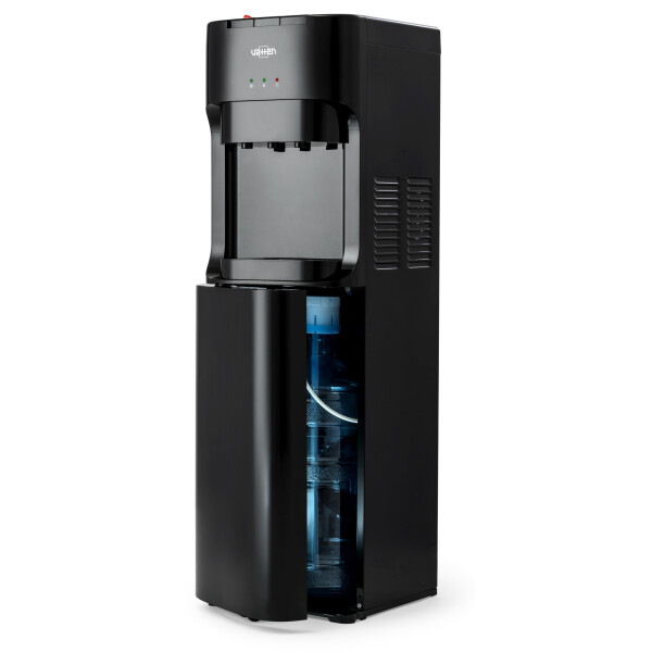 Кулер для воды Vatten L45NE с нижней загрузкой бутыли. Электронное охлаждение и с высокая производительность нагрева воды - до 6 литров в час (мощность водонагревателя 650 Вт). Для дома и офиса. Три крана, управление кнопками - горячая, холодная и вода комнатной температуры. Цвет корпуса черный. Верхняя и передняя панели изготовлены из высококачественного, устойчивого к ультрафиолету ABS пластика. Боковые панели стальные, окрашены в черный цвет. Три LED индикатора (включение питания, индикатор нагрева, индикатор охлаждения). Без холодильника, без шкафчика.