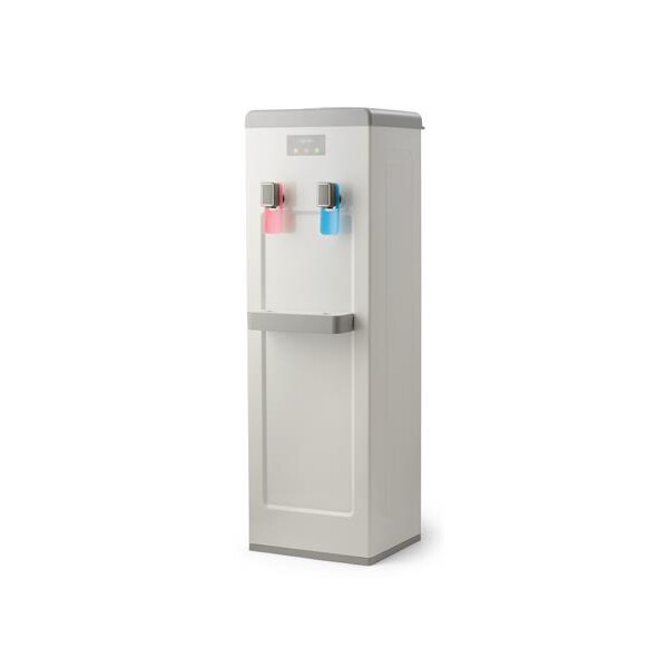 Напольный кулер для воды с компрессорным охлаждением и с высокой производительностью нагрева воды - до 6 литров в час (мощность водонагревателя 650 Вт). Кулер без шкафчика, высокий - высота без бутыли равна 1000мм. Верхняя загрузка бутыли. Корпус кулера изготовлен из стали окрашенной в белый цвет. Цвет корпуса белый. Два крана - горячая и холодная вода. Управление подачей воды - нажим на рычаг крана. На кране подачи горячей воды имеется защита от детей. Баки горячей и холодной воды изготовлены из нержавеющей стали. Кулер предназначен для дома и офиса.