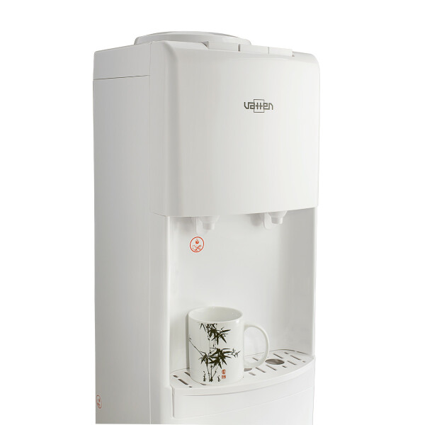 Стандартный напольный кулер для воды с электронным охлаждением (плата Пельтье). Без шкафчика. Современный дизайн. Для дома. Для офиса. Цвет корпуса белый, все панели изготовлены из качественного, устойчивого к ультрафиолету пластика. Два крана, управление кнопками - горячая и холодная вода. Кран горячей воды имеет "защиту от детей". Пригоден для эксплуатации в очень жарком климате - температура эксплуатации кулера от 10 до 38 градусов Цельсия.