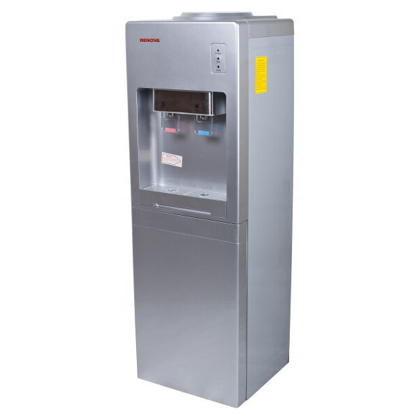 Напольный кулер для воды. С компрессорным охлаждением и с высокой производительностью нагрева воды - до 5 литров в час (мощность водонагревателя 550 Вт). Шкафчик объемом 16 л. Высота стандартная - 970 мм. Для дома. Для офиса. Два крана, управление "нажим кружкой" - горячая и холодная.