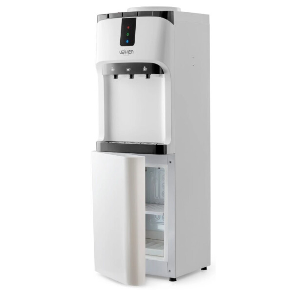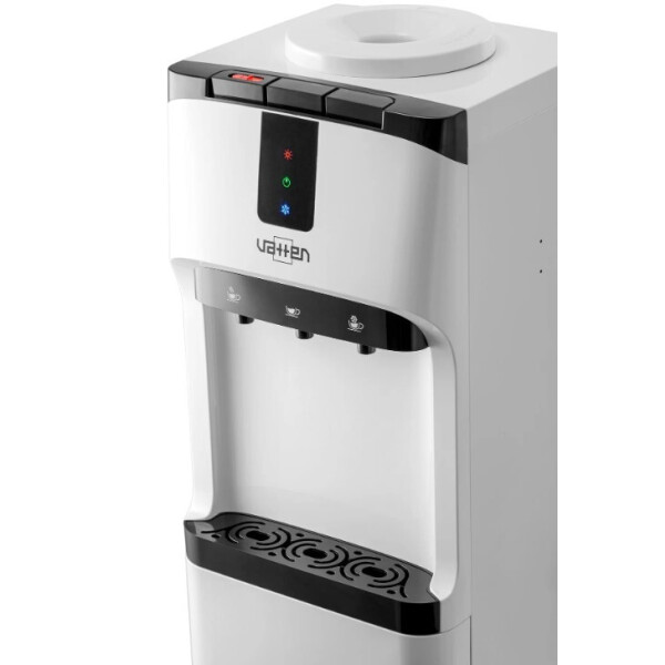Диспенсер Vatten V02WKB с узким белым корпусом не будет мешать даже в маленьком офисе. Сверху устанавливается бутыль, а снизу расположен холодильник на 12 л. Прибор способен не только подавать чистую питьевую воду, но также нагревать и охлаждать жидкость.