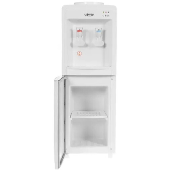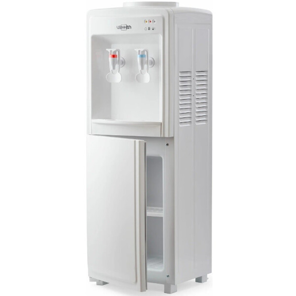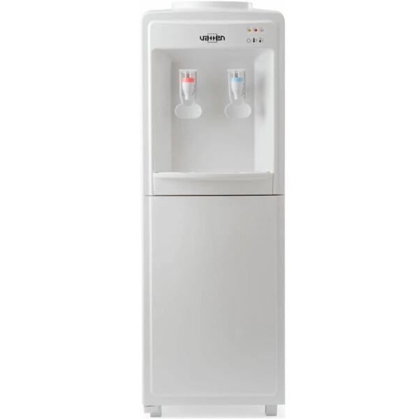 Диспенсер Vatten V09WF обеспечивает подачу холодной и горячей воды. Он выполнен в прочном пластиковом корпусе, предусматривающем верхнее расположение бутыли с водой и шкафчик объемом 9 л для хранения в нижней части. Подача воды осуществляется простым нажатием рычагов, которые оснащены цветными индикаторами. Напольный диспенсер Vatten V09WF оборудован панелью со световыми индикаторами для контроля состояния работы. Технология защитной блокировки крана с горячей водой повышает безопасность в эксплуатации.