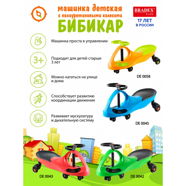 Уникальная чудо-машинка подарит Вашим детям множество часов удовольствия от вождения и игры. С самых маленьких лет Вы сможете занять Вашего малыша катанием на детской машинке БИБИКАР. Это удивительное запатентованное изобретение не имеет аналогов. Его конструкция не требует мотора или педалей. Выполняет функции не только детской игрушки и отличного развлечения для Вашего ребенка, но и способствует укреплению мышц с самых ранних лет, развитию координации и динамичности Вашего малыша.