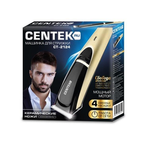 Машинка для стрижки Centek CT-2124 с аккумуляторной батареей удобна в повседневном использовании. Она может работать как от сети так и автономно, не ограничивая ваших движений сетевым кабелем. Продолжительность автономной работы достигает 50 минут, чего вполне достаточно для нескольких стрижек. Устройство выполнено в эргономичном корпусе золотисто-черного цвета. Комплектуется четырьмя насадками, которые позволяют регулировать длину стрижки в диапазоне от 3 до 12 мм. Также в комплекте вы найдете аксессуары для ухода за устройством - щеточку для очистки и масло для смазки лезвий.