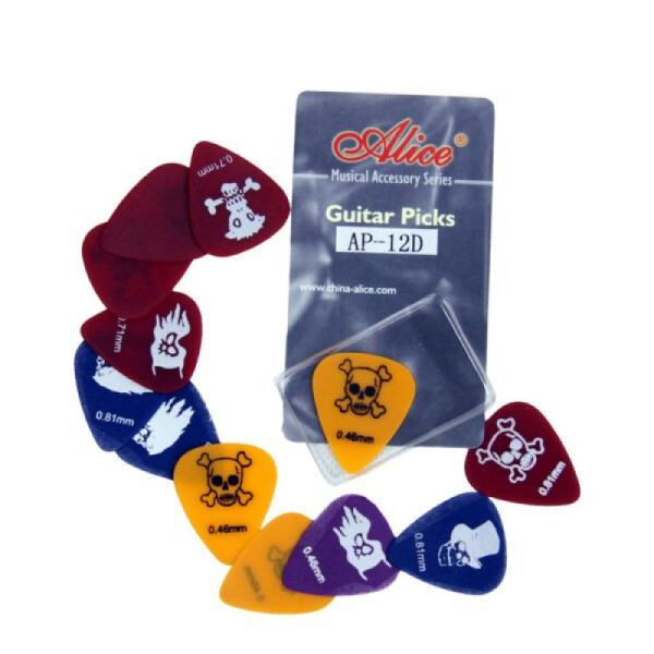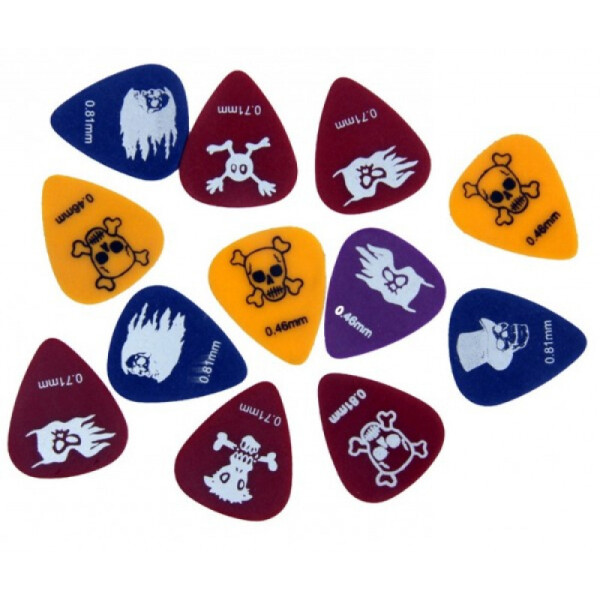 Набор содержит 12 медиаторов толщиной 0,46 мм., 0,71 мм. и 0,81 мм., стандартной формы, по 4 штуки каждой толщины.