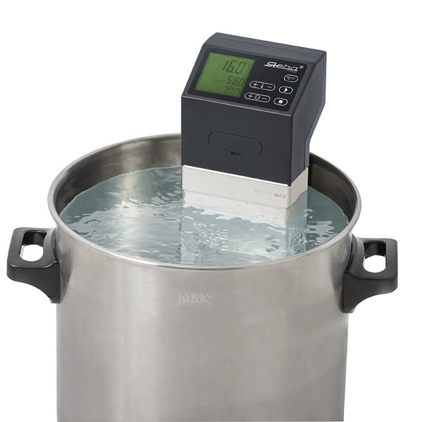 Су Вид Steba SV 100 (051000) предназначен для профессионального использования, с его помощью можно приготовить за одну закладку до 120 порций, сложив упакованные без доступа воздуха продукты в любую глубокую вместительную емкость. Меньше часа потребуется на подогрев 30 литров воды, куда складываются упакованные ингредиенты, продукты готовятся в собственном соку, не подгорая, с сохранением всех полезных свойств, цвета и естественного аромата. Этот метод обеспечивает приготовление низкокалорийных продуктов без использования жира и масла, что важно при диетическом питании. Блюда, приготовленные в вакуумной упаковке на водяной бане при низких в привычном понимании температурах, получаются вкусными, красивыми и дольше сохраняются. Су Вид Steba SV 100 позволяет заготовить запас продуктов, чтобы потом быстро их разогреть, просто опустив в кастрюлю с горячей водой. С помощью сенсорных кнопок точно устанавливается время и температура приготовления, дисплей отображает информацию о заданной и текущей температуре и время таймера.