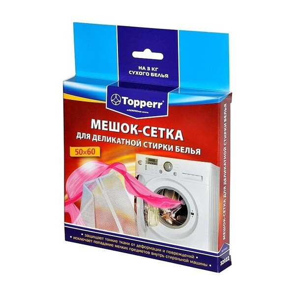 Мешок-сетка Topperr 32022 может вместить в себя до 3 кг сухого белья. То есть, если таков объем загрузки стиральной машины, которой Вы пользуетесь, то в него можно поместить все белье, подготовленное к стирке. В этом случае его будет легко вынуть в мешке и быть уверенным, что в барабане ничего не осталось. При этом вещи будут меньше деформироваться, спутываться и истираться о саму машину.
