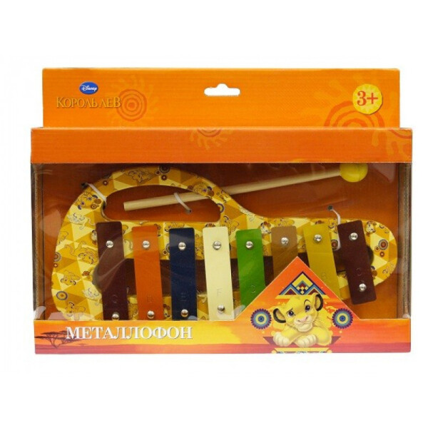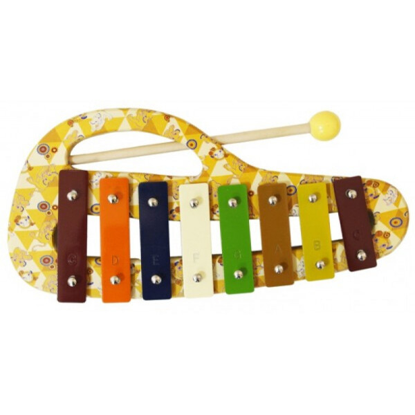 Данная модель имеет 8 разноцветных металлических пластинок, на каждой указана соответствующая ей нота, в комплект входит деревянная палочка для игры и руководство по занятиям с ребенком.
