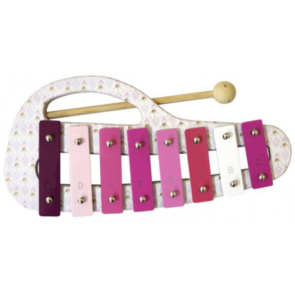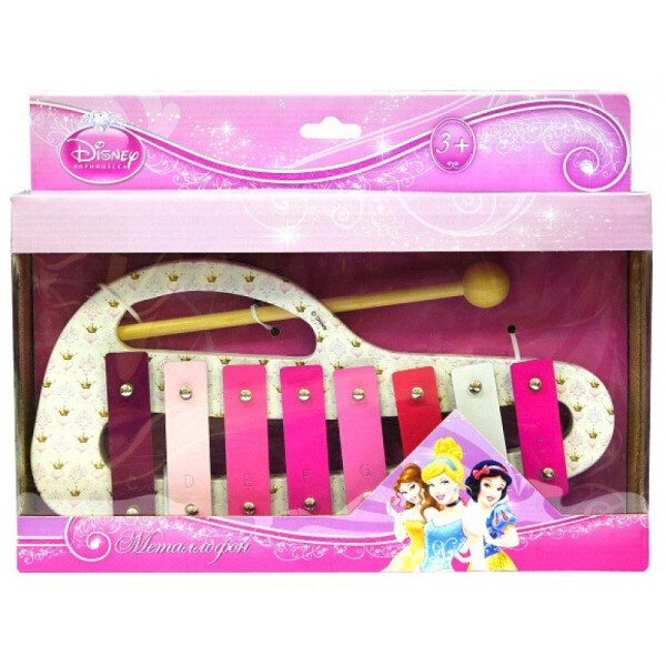 Данная модель имеет 8 разноцветных металлических пластинок, на каждой указана соответствующая ей нота, в комплект входит деревянная палочка для игры и руководство по занятиям с ребенком.