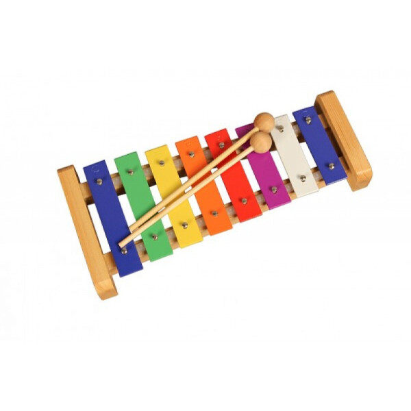 Данная модель имеет 8 разноцветных металлических пластинок, на каждой указана соответсвующая ей нота, в комплекте прилагается деревянная палочка для игры.