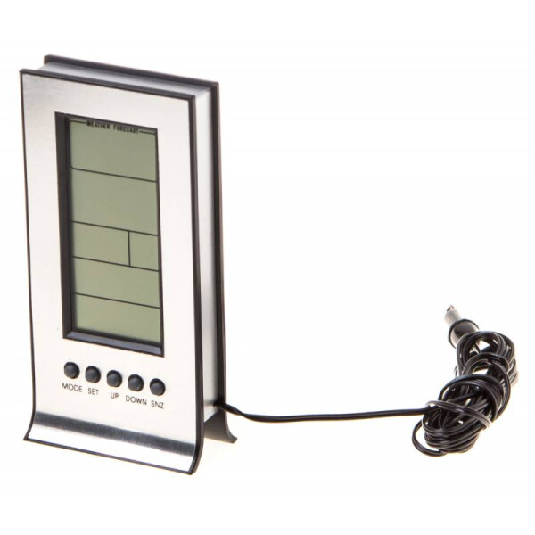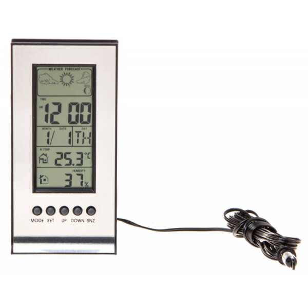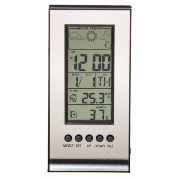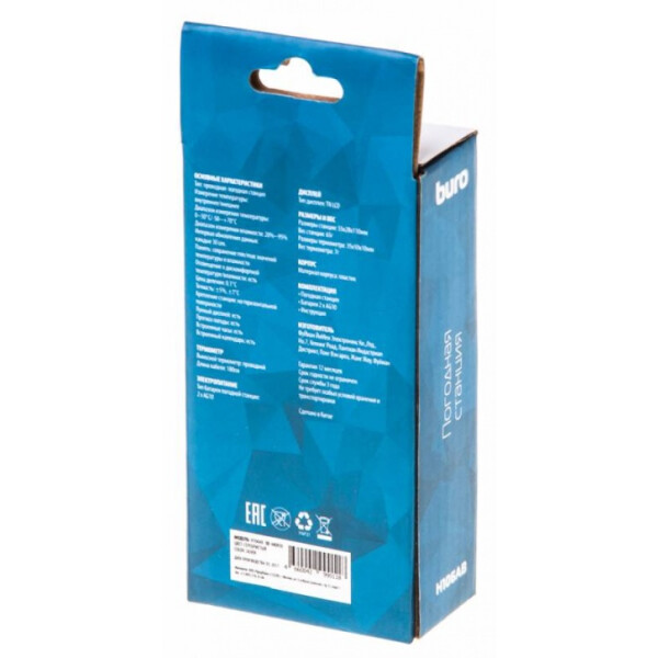 Метеостанция Buro H106AB может определять температуру воздуха в помещении и за его пределами. Кроме того, она измеряет относительную влажность в комнате. На ее большом ЖК-экране также отображаются: время, дата, анимированный прогноз погоды на ближайшее будущее и фаза луны. Устройство можно устанавливать в любом месте – оно не требует подключения к сети, поскольку получает питание от батареек.