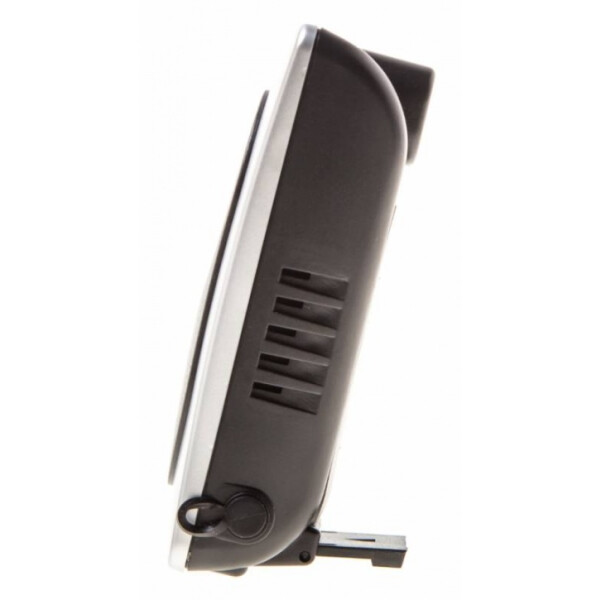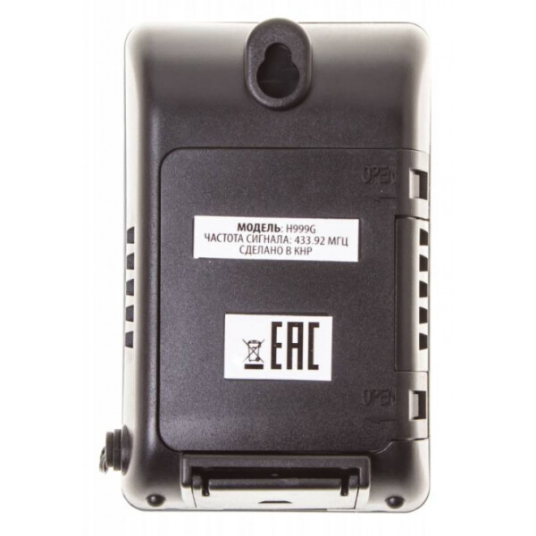 Прибор отображает данные в виде символов и цифр. Комфортной эксплуатации способствует наличие индикаторов заряда. Питание осуществляется от двух AAA-батареек для базы и двух таких же элементов для датчика. Метеостанция дополнена часами с будильником и календарем и имеет габариты 8x14x4 см.