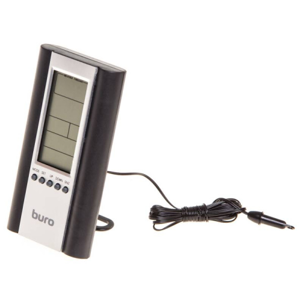 Метеостанция Buro H6308AB представлена в классическом серебристо-черном дизайне и предназначается для настенного крепления или настольной установки. Прибор позволяет контролировать температуру и влажность воздуха в помещении, а также уличную температуру. Измерения производятся в пределах -50…+70 градусов и 20-95%.