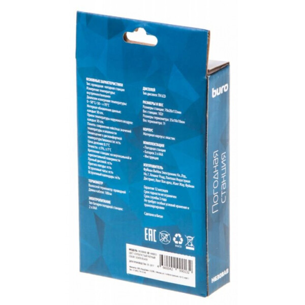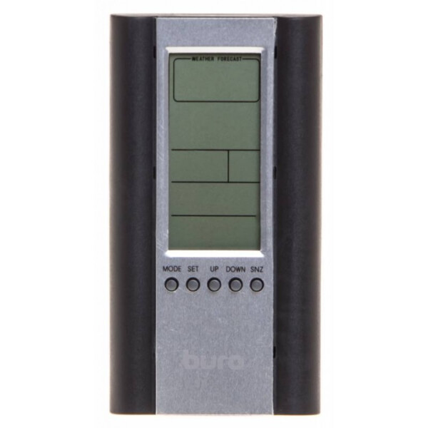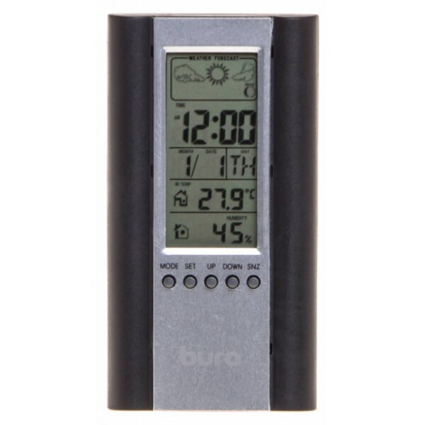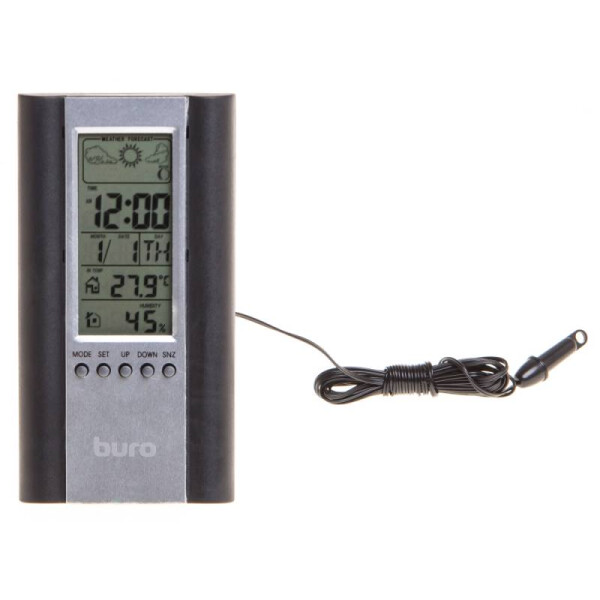 Модель Buro H6308AB дополнена анимированным прогнозом погоды, часами с будильником, календарем и определением фаз луны. Информация на монохромном дисплее отображается в виде символов и цифр. Питание осуществляется от батареек. Компактное устройство имеет габариты 7x13/3x2 см.