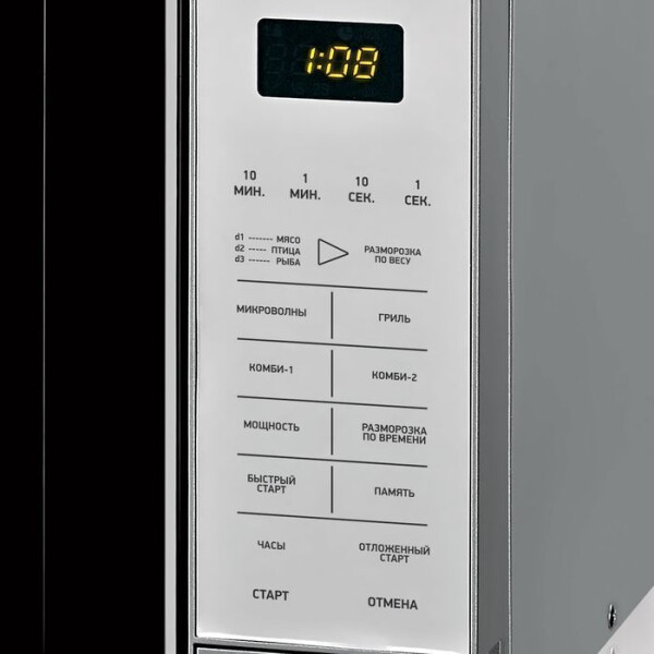 Разморозки по весу. В режиме микроволны печь имеет 5 уровней мощности. Максимальное время приготовления – 99 минут. Имеются так же 2 комбинированных режима работы с различным соотношением продолжительности использования микроволн и гриля. Рецепт, который требует разморозки продуктов, а затем их поэтапного приготовления в различных режимах, можно запрограммировать как одну операцию, используя функцию многоступенчатого приготовления.