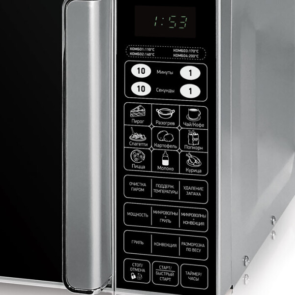 Современная и вместительная микроволновая печь 23MWC-982S/SB-M проста в управлении и довольно функциональна. Зеркальная передняя панель, LED-дисплей и электронное управление – вот составляющие стильного и лаконичного дизайна современной техники для кухни. Объем камеры составляет 23 литра. Существует 11 уровней регулировки мощности микроволн, максимальная – 900 Вт. Помимо привычных автоматических программ приготовления и размораживания блюд по весу, есть комбинированный режим, который заключается в использовании микроволн и гриля и подходит для приготовления больших кусков мяса или рыбы. Функция «Конвекция» позволит заменить духовку на микроволновую печь, если захочется полакомиться пирогами или бисквитом. Функция блокировки панели управления ограничит доступ ребенка к технике. Предусмотрена функция удаления запахов.