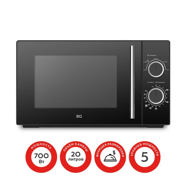 Микроволновая печь BQ MWO-24010SM/B в черном корпусе обладает стандартным объемом камеры 20 л.