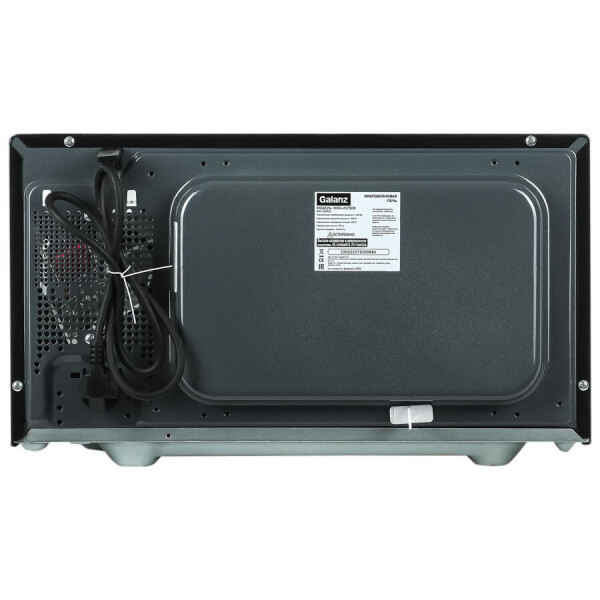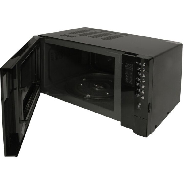 Микроволновая печь черного цвета обладает простым и удобным функционалом, что позволит пользоваться ей каждый день. Микроволны мощностью 900 Вт обеспечивают быстрый подогрев готовой еды, а также разморозку продуктов. Для настройки мощности и выбора времени работы микроволновки предусмотрены удобные поворотные переключатели с отметками. Вместимость внутренней камеры печи составляет 23 л, а значит, в ней легко помещается одна-три порции еды.
