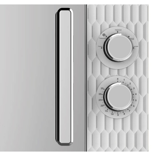 С помощью микроволновой печи вы сможете подогревать, размораживать и готовить различные продукты. Камера печи имеет вместимость 20 л и простое в очистке эмалированное покрытие. Поворотное блюдо характеризуется диаметром 25.5 см и изготовлено из прочного термостойкого стекла. В печи установлены таймер на 35 минут и навесная дверца с ручкой, позволяющая визуально контролировать готовность. Настройка нужной мощности и времени приготовления осуществляется на основе двух поворотных механических переключателей.