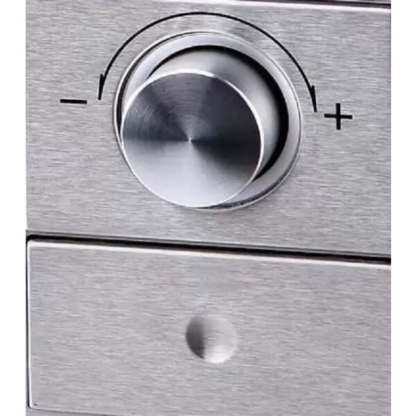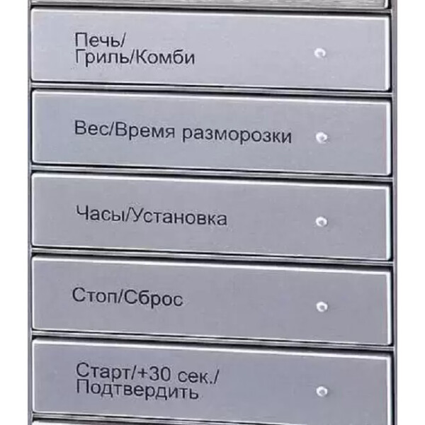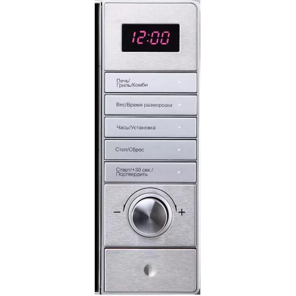 Электронное управление представлено широкими кнопками и поворотным переключателем для выбора программы (8 вариантов). После активации режима необходимо указать вес продуктов, чтобы печь самостоятельно рассчитала необходимую мощность и время работы.