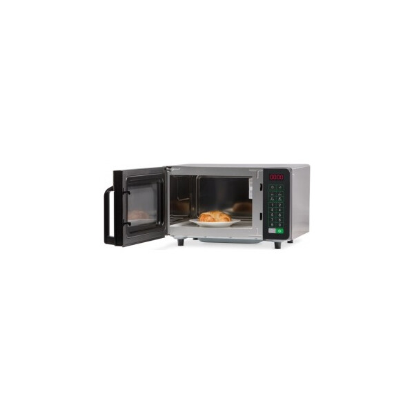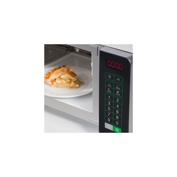 Печь микроволновая профессиональная с электронным управлением, прозрачным окошком из закалённого стекла в дверце имеет программируемое меню на 20 блюд. Размер камеры - 330х330х197мм. Объем камеры - 23л. Мощность СВЧ генератора - 1000Вт. Диаметр используемой посуды - до 305мм. Наличие 5 уровней мощности позволяет готовить блюда из свежих и замороженных продуктов. Режим разморозки. Печь оснащена электронным дисплеем, таймером обратного отсчета на 60мин., кнопками со шрифтом Брайля, функцией размораживания, подсветкой рабочей камеры, внутренней керамической полкой в днище. Можно запрограммировать до 3 шагов режима приготовления на одно прикосновение к сенсорной панели. Функция увеличения количества порций X2 производит подсчёт времени, требующегося для одновременного приготовления нескольких порций. Внешний корпус печи и рабочая камера изготовлены из нержавеющей стали. Обновленный дизайн. Сделано в США.