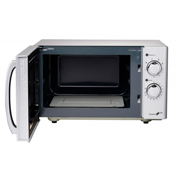 Управление моделью механическое. Изнутри микроволновая печь покрыта эмалированной сталью. Дверца открывается налево с помощью внешней ручки.