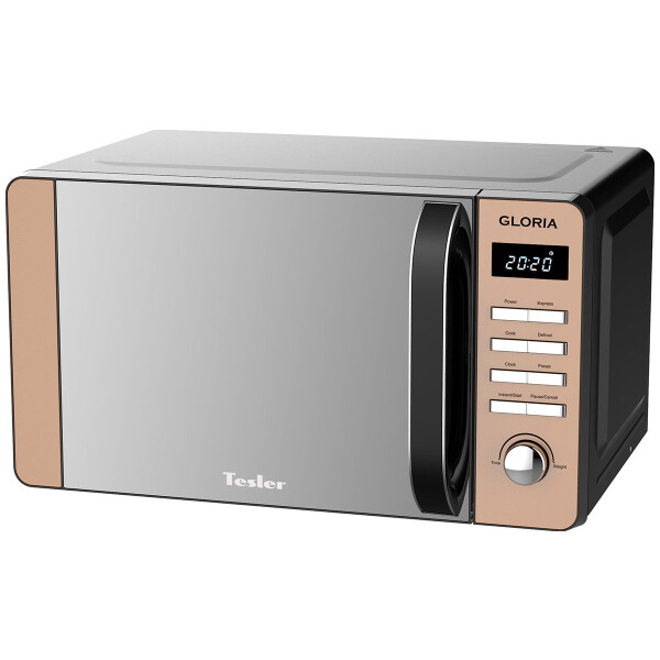 Микроволновая печь Tesler ME-2010 прекрасное украшение интерьера благодаря панели из нержавеющей стали с медным декором и дверцей из закалённого стекла с зеркальным напылением. Благодаря внутреннему покрытию камеры Crystal Clear избавится от загрязнений внутри СВЧ-печи стало еще проще.