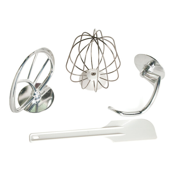 На корпусе миксера нанесены графические изображения режимов и настроек, поэтому разобраться с ними сможет даже начинающий пользователь. В комплектацию входят насадки для смешивания, взбивания и приготовления теста, а также удобный шпатель для очищения остатков продукта со стенок чаши.