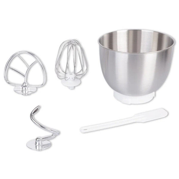 Миксер оснащен вместительной чашей объемом 5 литров, чаша изготовлена из нержавеющей стали, а пищевой пластик корпуса и алюминиевые насадки безопасны для здоровья, могут использоваться для приготовления любых блюд, в том числе, для маленьких детей.