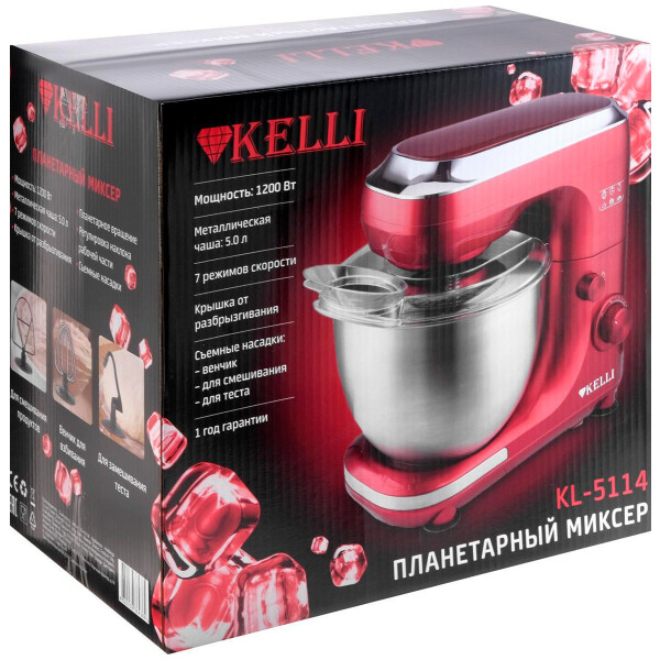 Домашний кухонный планетарный миксер Kelli KL-5114 с металлической чашей поможет вам смешать ингредиенты, взбить яичный белок или сливки, приготовить картофельное пюре, соус, крем, мусс, замесить тесто как жидкое, для блинов, так и густое, для мантов и пельменей, а также многое другое. Надежный двигатель высокой мощности 1200 Вт и 7 режимами скоростей позволяет быстро и эффективно смешивать ингредиенты разной консистенции для самых разнообразных кулинарных целей. Съемные металлические насадки. Планетарное вращение. Кнопка подъема верхней части корпуса. Надежная фиксация на поверхности. Крышка от разбрызгивания. Низкий уровень шума.