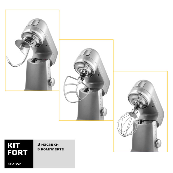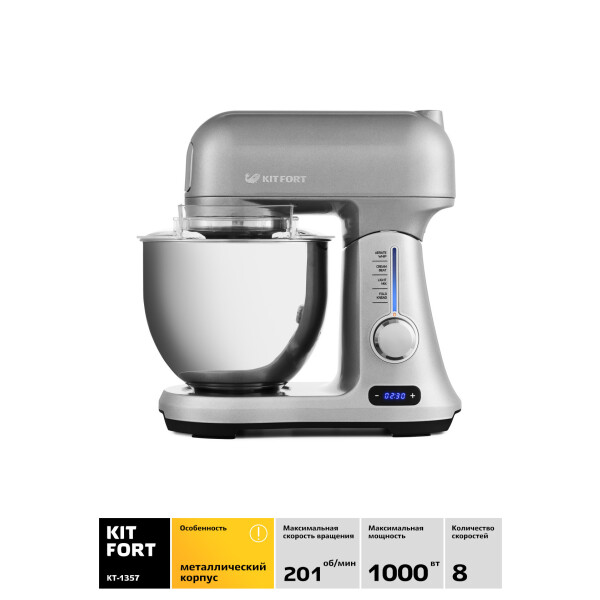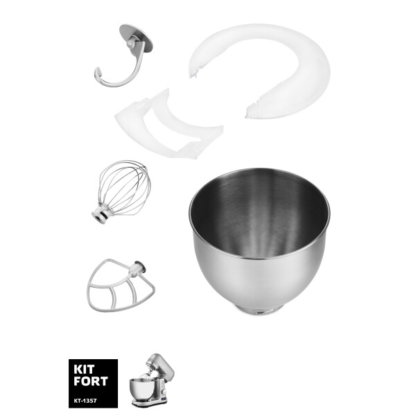 Стационарный миксер Kitfort КТ-1357 способен решить множество кулинарных задач. Он смешивает ингредиенты, взбивает яичные белки и сливки, делает жидкое и крутое тесто, а также готовит муссы, соусы, пюре и кремы. В этой модели реализована планетарная технология: насадки движутся таким образом, что содержимое чаши становится безупречно однородным, без комков.
