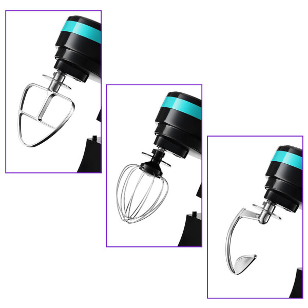 В комплекте идут венчик для взбивания, крюк для замеса крутого теста, насадка для смешивания и приготовления пюре. Форма насадок и чаши подобраны так, что почти при любом количестве продуктов насадка качественно их перемешает.