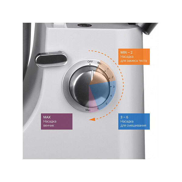 Инженеры снабдили миксер RFM-5301 8 скоростными режимами работы. Для качественной обработки продуктов, начинайте работу на минимальной скорости и постепенно увеличивайте ее с помощью регулятора на корпусе.