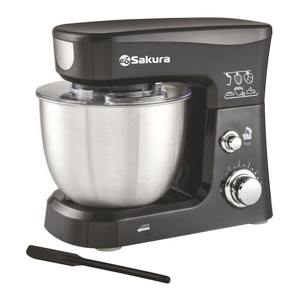 Миксер Sakura SA-6327BK настольный, с планетарным вращением насадок, максимальная мощность 1000 Вт, 6 скоростей работы, чаша из нержавеющей стали (3,5л.) с прозрачной крышкой и отверстием для добавления продуктов в процессе, 3 насадки (объемный венчик, плоский венчик и крюк), лопаточка в комплекте.