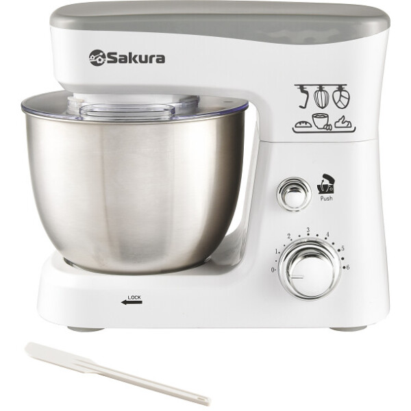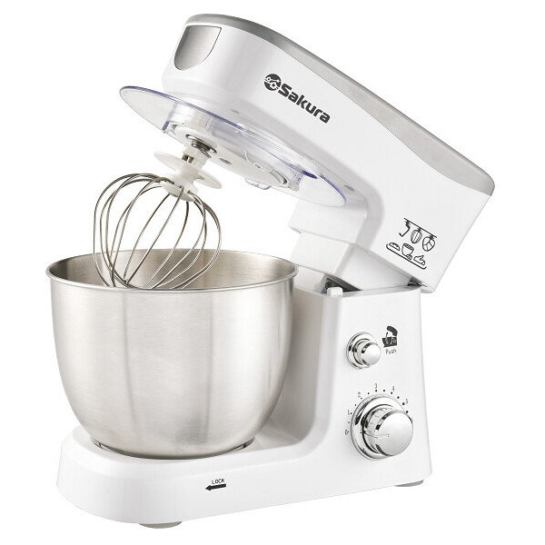 Миксер Sakura SA-6327W настольный, с планетарным вращением насадок, максимальная мощность 1000 Вт, 6 скоростей работы, чаша из нержавеющей стали (3,5л.) с прозрачной крышкой и отверстием для добавления продуктов в процессе, 3 насадки (объемный венчик, плоский венчик и крюк), лопаточка в комплекте.